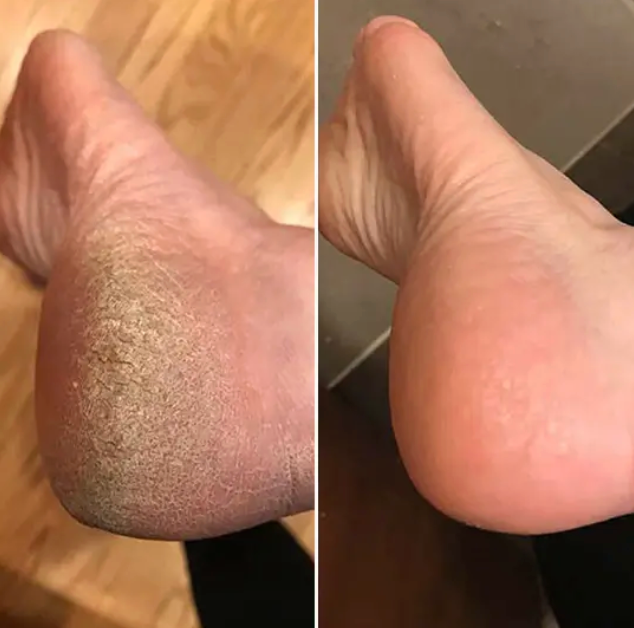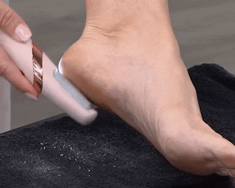 Gently roll over heels, balls of feet, or other rough spots. Use light, controlled pressure — let the roller do the work instead of pressing hard.